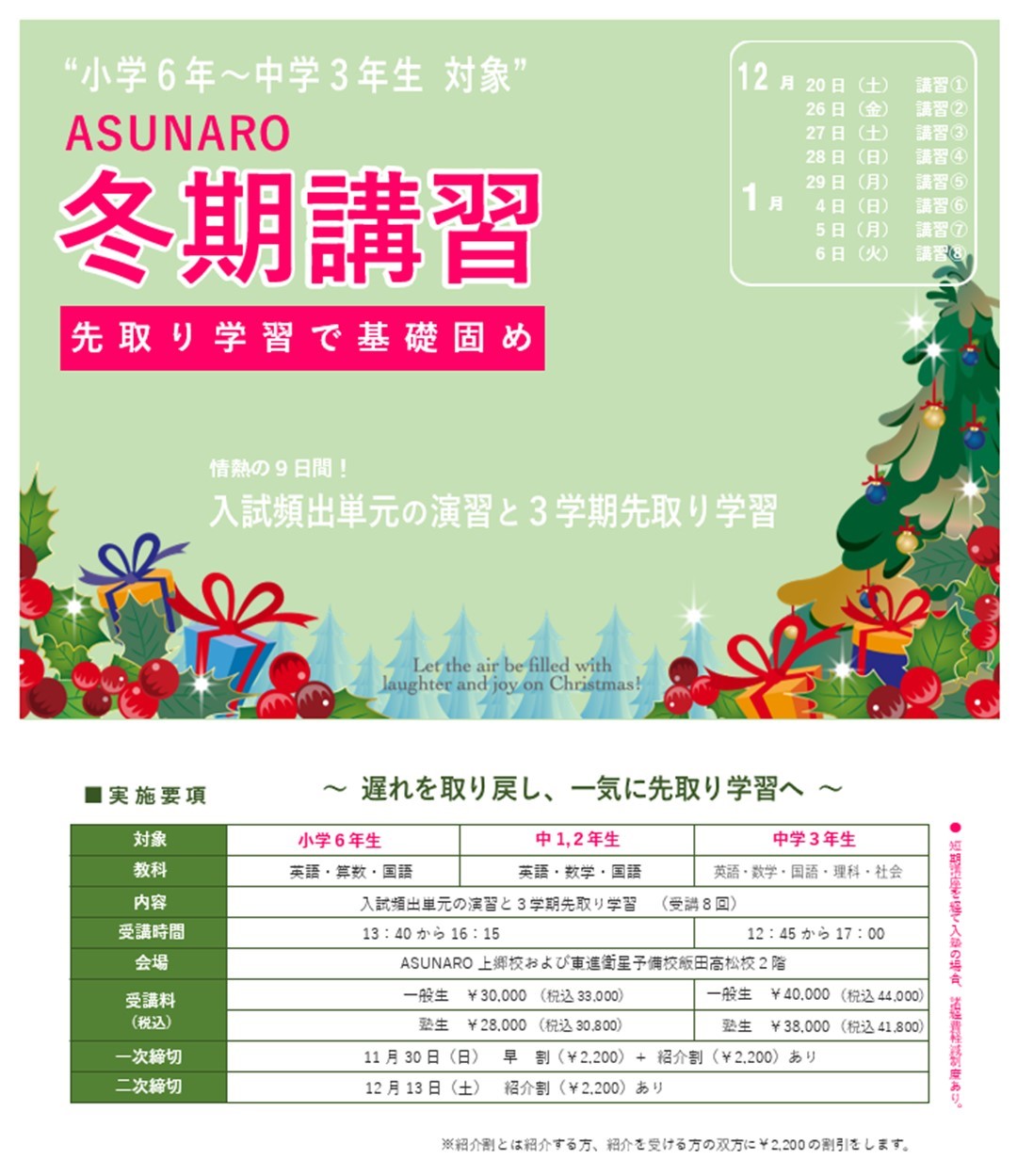 【締切迫る】ASUNARO冬期講習 12/13迄